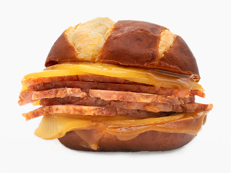 Ham off the bone with melted smoked gouda and honeycup mustard, on a toasted pretzel roll.