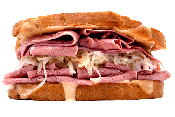 First-cut corned beef or turkey, swiss, sauerkraut and russian dressing, on rye.